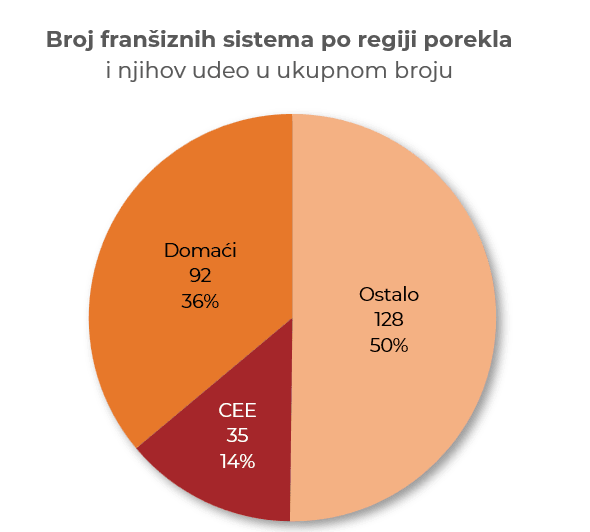 U rezultatima istraživanja, po prvi je put prikazana i struktura inozemnih franšiznih sustava po regiji podrijetla, gdje su brandovi podijeljeni na one koji dolaze iz zemalja Centralne i Istočne Europe (CEE) te sve ostale zemlje (Zapadna Europa, SAD, Azija). U dosadašnjoj poslovnoj praksi uočavamo, naime, veliki značaj „regionalnog“ u franšiznom razvoju, budući da se širenje franšiza izvan domaćeg tržišta najčešće i najlakše odvija u „usporedivom“, to jest, „susjednom“ okruženju. Prostor CEE, a posebno zemlje bivše Jugoslavije kao dio tog prostora, smatramo usporedivim okruženjem, kako zbog geografskih, tako i zbog ekonomskih, povjesnih i kulturnih sličnosti i veza. Tako, od ukupnog broja franšiznih sustava koji posluju u Srbiji, njih ukupno 127 – praktički polovica – potječe s prostora CEE (od čega je 92 iz Srbije, a 35 iz ostalih zemalja CEE). Preostalih 128 sustava potječe iz Zapadne Europe, SAD ili Azije.