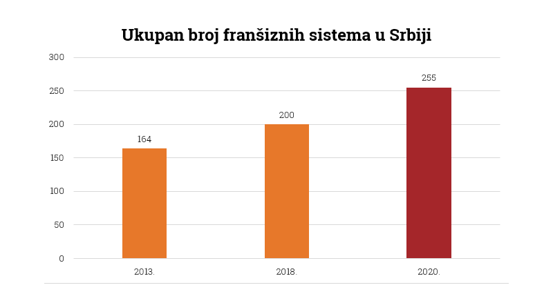 Na tržištu Srbije tijekom 2020. aktivno je poslovalo 255 franšiznih sustava, što je rast od 27,5% za period od posljednje dvije godine – naime, po prethodnom istraživanju PROFIT systema, u Srbiji je na kraju 2018. godine poslovalo ukupno 200 franšiznih sustava.
