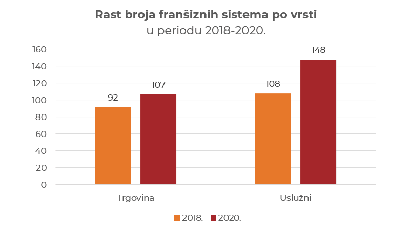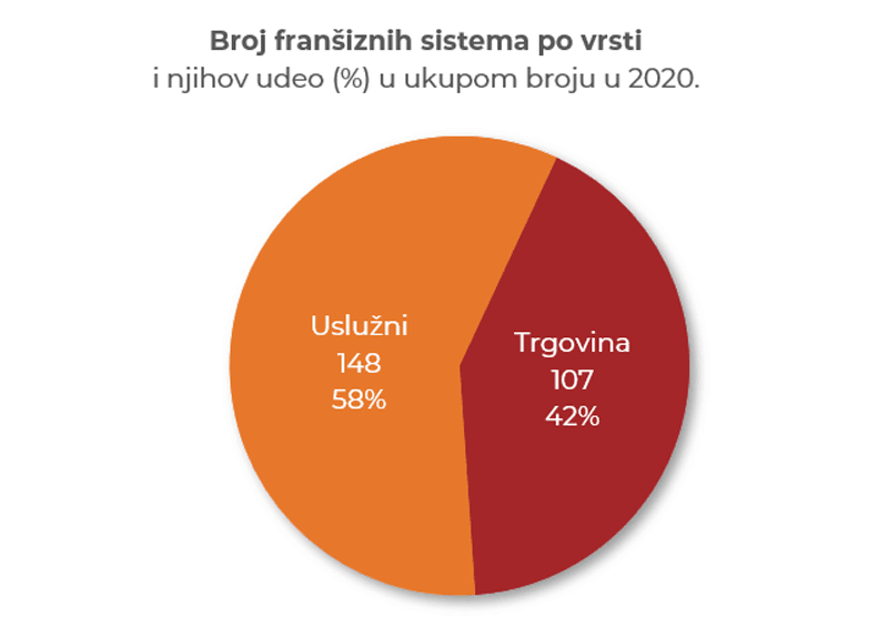 Franšizni sustavi uslužnih djelatnosti, sa 148 brandova, čine 58% ukupnog broja aktivnih sustava. Brandova koji posluju u trgovačkim branšama je, pak, 107 i čine 42% ukupnog broja franšiznih sustava. Ako posmatramo razdoblje u odnosu na prethodno istraživanje, uočava se da nešto brže raste broj franšiznih brandova u uslužnim djelatnostima nego u trgovini.