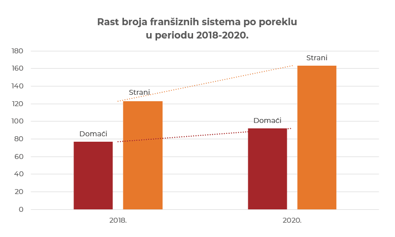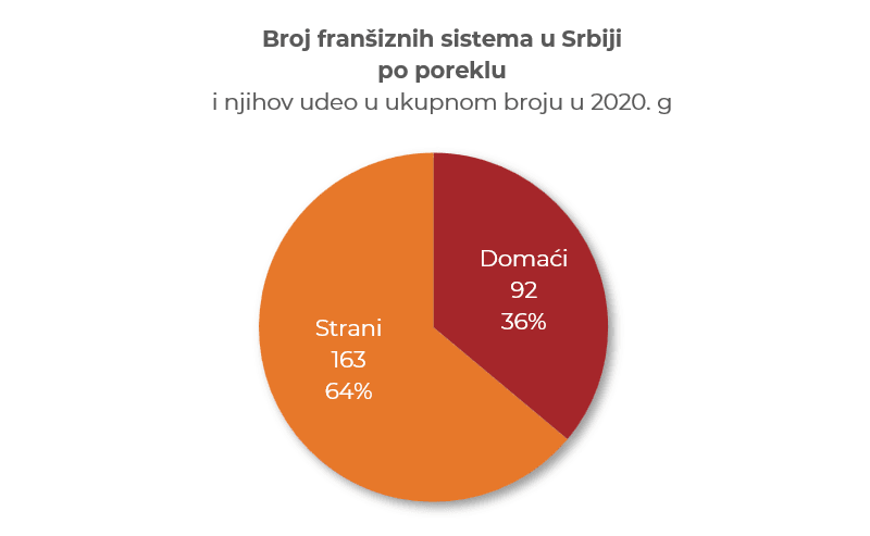 Od ukupnog broja franšiznih sustava, 163 inozemnog je podrijetla – riječ je o franšiznim sustavima iz inozemstva koji u Srbiji posluju putem primatelja franšize – što čini 64% od ukupnog broja. Aktivnih domaćih franšiznih sustava, gdje je kreator franšize iz Srbije, ima ukupno 92, što, pak, čini 36% od ukupnog broja sustava. Sličan je odnos domaćih i stranih franšiznih brandova zabilježilo i istraživanje iz 2018. godine, kada je taj odnos bio vrlo sličan: sa 62% stranih i 38% domaćih sustava.